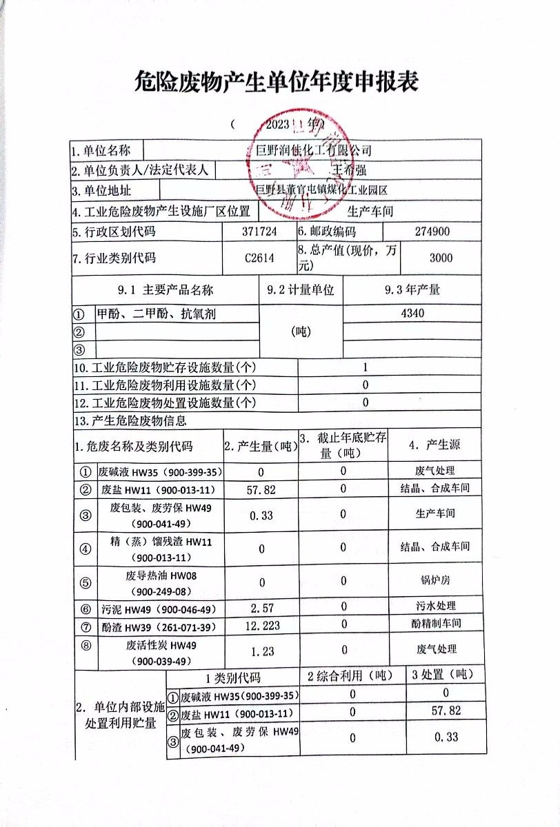 • 巨野潤佳化工有限公司2024年申報報表